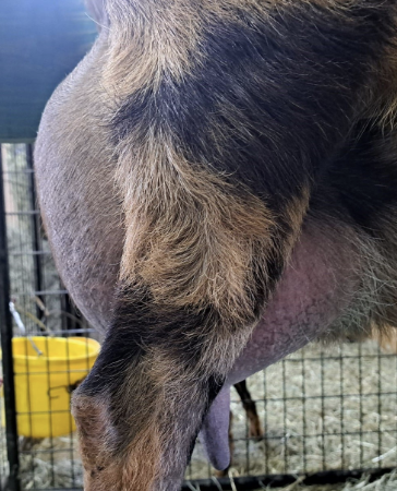 His lineage has a long and impressive history of milk production that has been proven through milk testing time and time again. His dam has long, hand-miling teats that are described as having a “good stream and she empties right down quickly” by her owner at The Mosaic Menagerie. Moose’s sire’s dam has lovely foreudder extension, teat placement, and attachment.