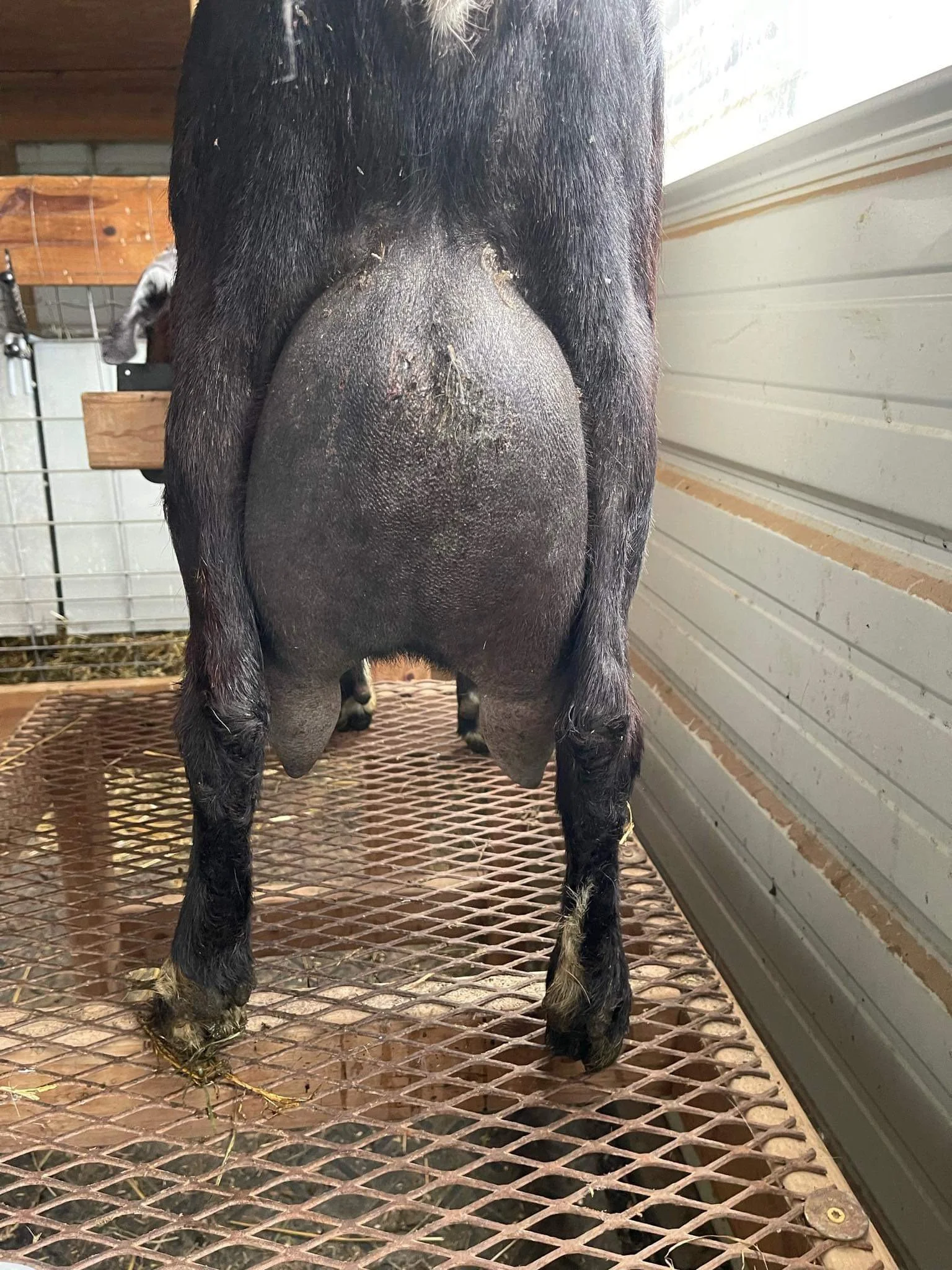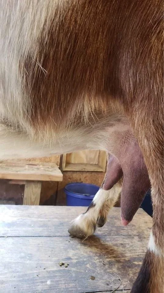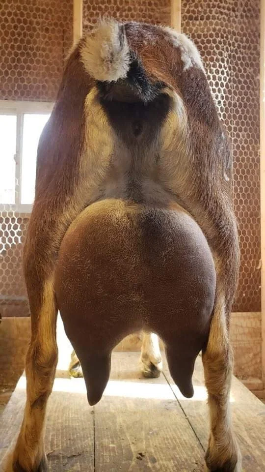 River was owned by Hesed Farms at the time we purchased Gwen. River has a beautiful bag and great hand-milking teats. According to farmer Rachel of Hesed Farms, River was giving a gallon of milk per day at her peak on a twice a day milk schedule. River had had many years of successfully kidding multiples: FF=twins, 2F=triplets, 3F=quads, 4F=quints, 5F=triplets.